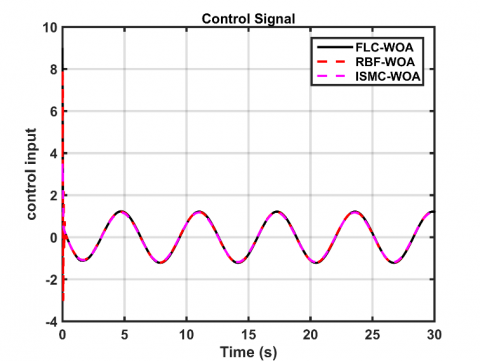 Figure 13. Control input by using FLC-WOA, RBF-WOA and ISMC-WOA laws