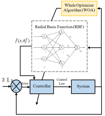 The RBF neural network control algorithm has gathered a lot of concern regarding its ability to be adopted in many control strategies. It can be employed in the tuning process via the back-propagation algorithm (determining the parameters of PID or any given controller), furthermore it can successfully approximate any nonlinear function or parameter and it can also apply as a filter or address uncertainties.