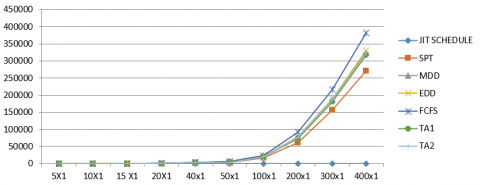 Figure 7 reveals that FCFS and SPT yielded the highest deviation from the JIT schedule for all the problem sizes. Also, other solution methods show higher deviation at problem sizes; n$\leq$40. As the problem sizes exceeded this limit, the deviation becomes not significant for all the solution methods except FCFS and SPT.