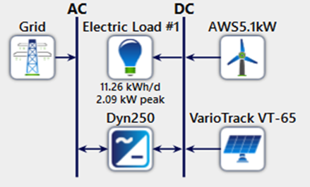 HOMER replicates the above two settings on the same area and load to assess system performance in different conditions based on expenses such as expected installation costs, operation and maintenance costs, replacement costs, interest costs, and energy prices. The grid-connected hybrid system's major components are the wind turbine, PV array, Dynamo power, and Struder Vario Track, as show in Figure 10. The following values are used in economic analysis.