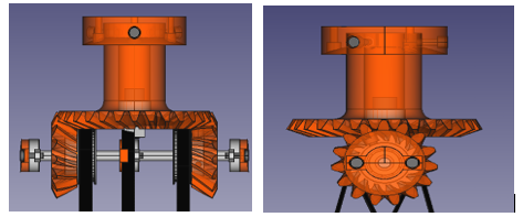 The second joint is revolute with 120° rotations about the y-axis of the reference frame, powered by 2 stepper motors. The stepper motors are fitted with 2 helical gears which mesh with the inner teeth of the shoulder carrying the second link of the robotic arm with a 5:1 gear reduction ratio with 121.2N.cm of holding torque. The 3D model of joint 2 is shown in Figure 5.