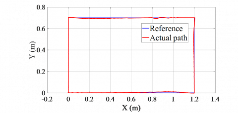 The errors according to the X, Y, orientation angle, and distance errors are displayed in Figures 18 (c), (d), (e) and (f), respectively. From the previous response estimated from the encoders and the real 2D print of the trajectory, we can say that the control methodologies have been successfully realized with a low tracking error.