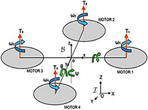 For a quad-rotor, the lift force is distributed in four shares, one to each rotor and these forces are transmitted to the propellers (T1, T2, T3 and T4) according to the rotor/motor numbering. Figure 22 shows Quad-rotor frames, forces, torques and control.