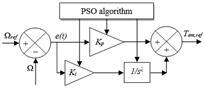 The proposed FOPI-PSO controller is illustrated in Figure 4, it contains three parameters (Kp, Ki and λ) to be optimized offline by the PSO method. This optimized controller will provide at its output the reference torque necessary to control the speed with precision and more robustness than the conventional PI controller.