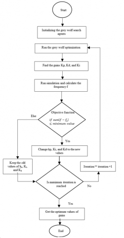 The objective function of the grey wolf algorithm is used to minimize the deviation in the frequency. The grey wolf algorithm efficiently reduces the deviation and comes with good results through the process of optimization. The algorithm is carried out to extract the values of the PID controller gains, Kp, Ki, and Kd. The constraint is the minimum value of frequency deviation that govern the stability of the system. The values resulted from the optimization process is used in the system simulation to drive the system under the optimized values of the controller gains. The optimization process flow graph is seen in Figure 2.