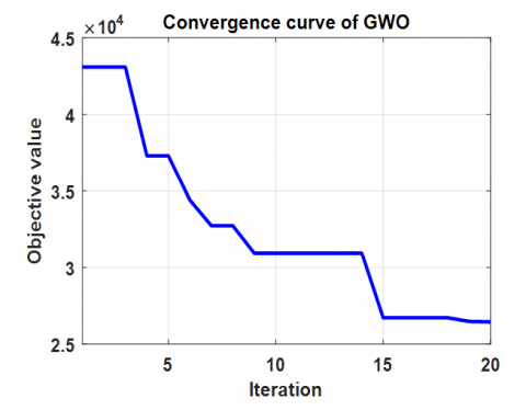 It is clear that the overshot without GWO is too high which triggers the protection system. Figure 4 shows the convergence of GWO. It can be seen that the used optimization method has an optimum solution after a number of iterations. The optimal values of the PID controller parameters are listed in Table 1.