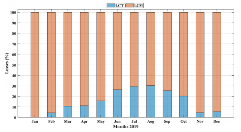 As far as capture losses ($L_c$) are concerned, they can be divided into two components, namely thermal (LCT) and miscellaneous capture losses (LCM). The LCT evolves as a function of the seasonal temperature variation of the PV cells. In order to calculate the LCT, the module temperature ratio (- 0.44%/°C) is used for the power. Therefore, due to the higher temperature of the cell, the higher LCT is 0.7963 h/day in June and the lowest is 0 h/day in January because of the lowest temperature of the cell (below 25°C).