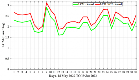 Figure 19 illustrates the miscellaneous capture losses (LCM) of two sub-fields for the studied period. The average capture loss LCM for the uncleaned sub-field is 2.39 h/day. However, this average is reduced by a rate of 11.71% for the cleaned subfield (2.11 h/d).