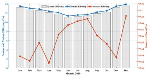 The measured annual average monthly efficiency of the array, inverter, and system are presented in Figure 9. The higher cell temperature recorded in summer results in a maximum reduction of array efficiency. The lower value of the array efficiency noticed in June is 11.36%, which represents a decrease of 24.26%. The reduction of the cell’s temperature in the autumn leads to an improvement in the array efficiency, which reached 12.73%. The array efficiency value is measured in spring as 12.45%, which represented a drop of 17% from the rated efficiency. However, in the winter period, a maximum array efficiency of 13.48% is achieved due to the weak cell temperature. In addition, the 13.91% highest amount of the PV array efficiency is reached in December, where the cell temperature is minimum. According to the average annual efficiency of the array, it is found an amount up to 12.55%, which represents a reduction of 16.33% compared to the array's nominal efficiency. The inverter’s efficiency is affected by the in-plane variation of solar radiation [20] and the ambient temperature [21]. It is noted that the efficiency of the inverter remains stable with a recorded annual average of 97.66%. The system efficiency is highest when both the array and the inverter are at their maximum efficiency. The system's maximum efficiency is 13.17%, which is recorded in winter.