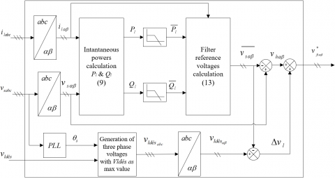 ifpαβ and vfpαβ present the currents and voltages of the shunt filter and vsαβ are the voltages.