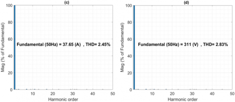 Dynamic demeanor beneath sudden differences in load, by inserting another load including the same value at [t=1.25s] which is explained in Figures 11(a) and (b) in which source voltage and source current of a-phase before compensation and after compensation is presented. It is obvious to notice that the grid current, after using the control, is pure sinusoidal, furthermore, actually, in this transient state, the unity power factor purpose is successfully gained. the proposed technique is well validated in Figures 11(c) and (d) in which the source current harmonic spectrum before and after compensation is proved.