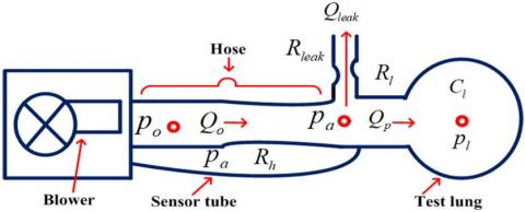Assuming that the standard resistances of the hose, leak channel, and patient lungs have been identified, will be express the flow rates of the blower, patient, and leak as functions of these resistances, as shown below [24-26]: