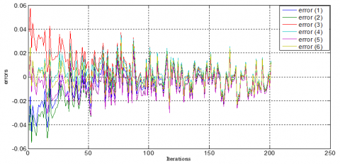 On Figure 6, the six components (e(1)-e(6)) of the error values minimized by the visual control law are illustrated, showing successful monitoring of the target. Initially, the error values ranged between [-0.035, 0.048], but after 200 iterations, the error decreased to [-0.003, 0.002], which is an acceptable level of error; corresponding to 0.3%, we can deduce that the precision is 99.7%.