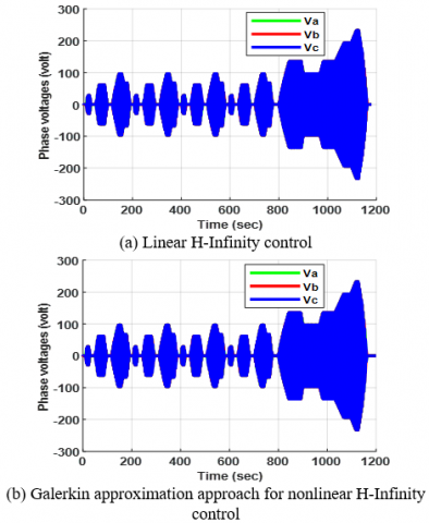The phase voltages, phase currents, Tractive force, stator voltage components and traction power during the period of operation under the NEDC driving cycle for the linear H-Infinity and Galerkin approximation approach for nonlinear H-Infinity strategies are shown in Figures 10-13, respectively. It can be noticed that the phase voltages and phase currents are perfectly sinusoidal, their behavior as well as the frequency adapt as a result of the speed variation. The dynamic variation of tractive force and traction power corresponds to the changes of speed; the behavior of the tractive force is the same as that of the electromagnetic torques and traction power is shown as positive while power recovered during regenerative braking is negative. The shape of the stator voltage components depend on the reference speed.