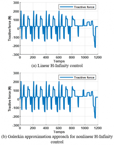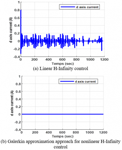 Figure 7 depicts the response of the PMSM d-axis current by using the both control methods. It can be observed that the d-axis current responses rapidly follow the reference d-axis current for the duration of all low or high speed trajectories. The two approaches presented remarkable performance of tracking. Nevertheless, significant d-axis current ripples are observed in the case of linear H-Infinity control while the approach based on Galerkin approximation for nonlinear H-Infinity control strategies present unobservable ripples. That ripples in the d-axis current, particularly noticeable with the linear H-Infinity control approach, indicate a potential instability leading to undesirable variations in the motor's behaviour, there by affecting overall vehicle performance. These results show that the Galerkin approximation approach for nonlinear H-Infinity method gives better performance for the EV system during the NEDC cycle.
