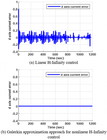In summary, the tests carried out through this section confirm that the Galerkin Approximation Approach for Nonlinear H-Infinity control technique significantly reduces the speed tracking error and d axis current error while also enhancing the quality of the d axis current. This approach also provides a faster dynamic response.