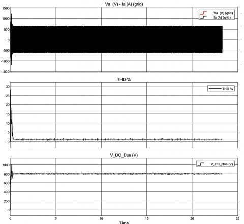 Figure 8. Shows the grid voltage and current, total harmonic distortion, and the voltage of DC-Bus