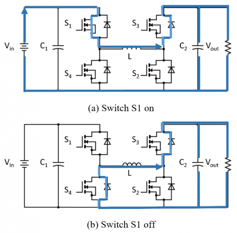 According to Table 1, buck operation in the forward direction requires S1 as the switching device while all the other switches are turned off. Figure 2 shows the power flow direction while S1 is switching. When S1 is on, (Figure 2a), the battery provides power to the inductor L and load. When S1 turns off, (Figure 2b), the antiparallel diode of S4 is forward biased and the inductor provides energy to the load.