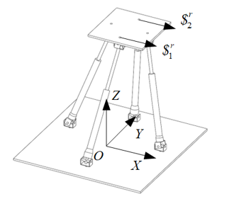Compared to 6-DOF parallel mechanisms, parallel mechanisms with fewer DOF cannot perform some complex motions, but they have advantages such as simple structure, low cost, fewer drive components, easy control, and large workspace. Rolland [3] proposed two types of 4-DOF parallel mechanisms for material handling: Manta & Kanuk. Tsai and Joshi [4] analyzed and studied the 3-UPU parallel mechanism through research on the structural characteristics of parallel manipulators. Chen et al. [5] proposed a 4-DOF parallel platform manipulator with 2 Rotational Prismatic Spherical (PRS) and 2 Prismatic Spherical Spherical (PSS) support chains, and conducted a kinematic analysis of this 2T2R parallel mechanism. Li and Huang [6] used the method of constraint synthesis for a systematic type synthesis of 4-DOF parallel robots, and proposed a 2R2T parallel mechanism with 2 symmetrical support chains. Yoon and Ryu [7] proposed two types of 4-DOF spatial parallel mechanisms with two platforms: 1T3R and 2T2R. These are relatively early studies on parallel mechanisms with fewer DOF.