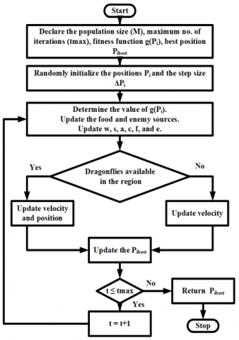 where, ${{r}_{1}}$ and ${{r}_{2}}$ are random numbers between 0 and 1, β is constant. The algorithm of dragonfly is illustrated in flowchart shown in Figure 5.