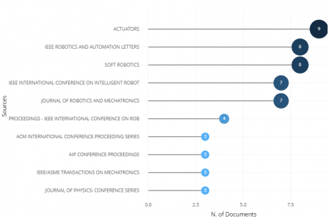 The analysis of leading journals in this area of research shows that, “Actuators”, “IEEE Robotics and Automation Letters”, “Soft Robotics”, “IEEE International Conference on Intelligent Robots and Systems (IROS)”, and “Journal of Robotics and Mechatronics”, form the top 5 influential publications with respect to the quantity of the articles published, as shown in Figure 10. These same journals have a sway over most citations as well, as indicated by the superior H-index of the articles published in them (refer Figure 11).
