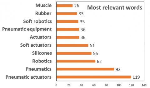 Soft robotics is a multi-disciplinary area of research encompassing different actuation methods, materials, and control systems. When it comes to SPAs, the top theme of research can be summarized by means of the most relevant keywords used in their publications. The actuation method, viz., “pneumatic actuators” and “pneumatics” are found to be comparatively the most prominent keywords, being used in 119 and 92 articles, respectively, see Figure 8. Silicone-rubbers seems to be the typically used materials for fabrication of these SPAs. The word growth pattern shown in Figure 9 highlights the rapid rise in the research in the topics related to “pneumatic actuators”, “pneumatics”, and “rubber” based materials.