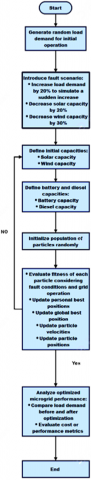 Lastly, for the sudden decrease in solar and wind capacities fault scenario, Particle Swarm Optimization (PSO) was identified as the best optimization method based on its lowest cost compared to GA and SA.