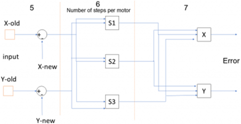 Next, Figure 9 shows the block diagram that calculate the number of steps each motor spins during each movement.