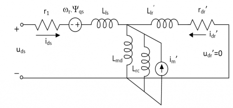 where, $\omega_r$ - rotor angular velocity; $\Psi_m^{\prime}$ - stator flux generated by the PMs; Lls - Leakage inductance of the stator winding; Lmd and Lmq - magnetizing inductances of d, q axes; ids, iqs - stator current of d, q axes; i'dr, i'qr - rotor equivalent current of d, q axes.