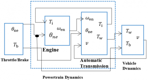 The longitudinal dynamics of the vehicle which is shown in Figure 1 is consists of two subsystems, The first one includes the engine, gearbox, and torque convertor while the second one related to external forces applied to the vehicle. In Figure 1(a) and (b), the model of the engine and torque converter are shown respectively and are represented by the following equations: