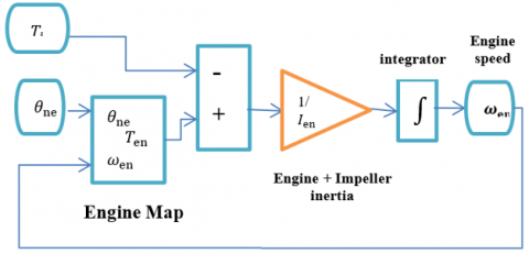 $I_{\mathrm{en}} \dot{\omega}_{\mathrm{en}}=T_{\mathrm{en}}\left(\theta_{\mathrm{ne}}, \omega_{\mathrm{en}}\right)-T_{\mathrm{i}}$ (1)