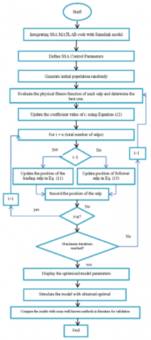 The SSA randomly deploys all search agents (salps) around the specified search space. It then evaluates the current salp set to determine the leader and forces others to follow. Eq. (12) is used in this step to update the variable r1. Eq. (11) provides the SSA with information about the leader's condition, and Eq. (13) adjusts the follower salps' location correspondingly. To improve the quality of the salps as much as feasible, all steps—aside from the initialization phase will be repeated until the stopping condition is satisfied.
