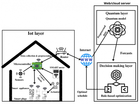 The IoT Layer serves as the foundation of the framework, enabling real-time data collection from smart home devices such as sensors, smart meters, and smart appliances. These devices monitor energy consumption, environmental conditions (e.g., temperature, humidity), and user behavior. The collected data is transmitted to a central micro-controller for preprocessing, where it is cleaned, normalized, and prepared for transmission into the quantum layer.