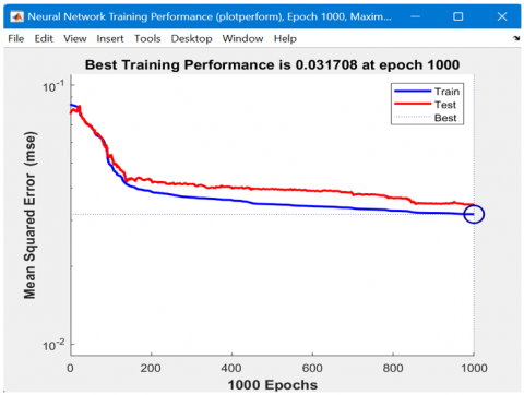Figure 11 contained three subplots that showed regression performance for the ANN during the learning process to evaluate the predicted outputs matching percentage to the target values. This figure represented the best-fit line according to the target value in the x-axis and according to the value of the predicted value. The subplot in the top left was related to training data ANN performances with a regression coefficient equal to 0.93444 R which meant that the model had a strong correlation between predictions and actual values. The left top subplot with green line indications represented the testing data for ANN model performances with R=0.92855, which was lower than training, indicating good generalization. The last subplot figure with red line indicators represented the overall system performances with a value of 0.93297 which combined training and test data. These values of training, testing, and overall system near 1 indicate strong predictive performances. In Figure 12, the ROC curve was presented to determine the classification performances for the ANN model. In this figure, the false positive coordinator was on the x-axis while the correctly classified sample was on the y-axis. Two lines represented two class classifications; the ANN model represented high accuracy due to the closeness of the top left corner for ROC. It also means that the ANN model effectively distinguishes between classes with minimal false error for both classes. This model based on these results demonstrated a strong regression accuracy with excellent classification ability due to the high value of ROC. It also meant that ANN is well trained and also had a good optimization for the given dataset.