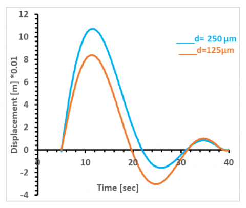 Figure 13. Relationship between displacement and time using (d= 250 µm) and (d= 125µm) of ferromagnetic powder