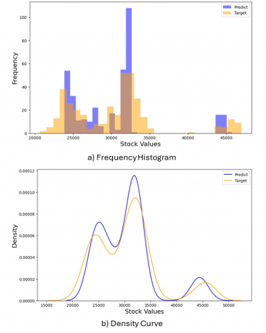Figure 7. a) Frequency histogram: Distribution of predictions versus target. b) Density curve: Comparison of density distributions between predicted and target values