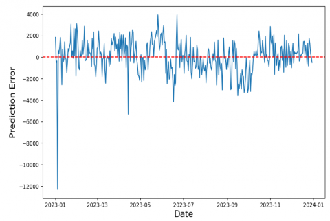 Overall, the prediction errors fluctuate around zero, suggesting the absence of a substantial systematic bias over the observed period. However, the magnitude of the errors shows notable variability: most values lie between approximately –4,000 and +4,000, though several extreme outliers fall well outside this range. One particularly large negative deviation, recorded at the beginning of 2023, approaches –12,000, indicating a highly inaccurate forecast at that point. From a temporal standpoint, the first half of the year is marked by greater dispersion and more frequent pronounced peaks, both positive and negative. In contrast, the second half of the year exhibits slightly reduced variability, hinting at a modest improvement in model stability. Nevertheless, the persistence of sizeable deviations, even towards year-end, suggests that certain conditions or unforeseen events continue to challenge the model’s predictive performance.