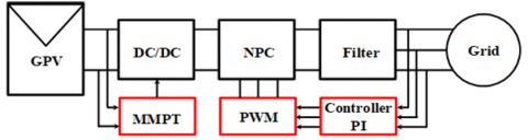 In this context, Boucheriette et al. [7] propose a grid-connected PV system using a five-level NPC inverter to reduce harmonic distortion and provide better capacity. Voltage from a PV system has fluctuations corresponding to solar radiation, thus, a PI regulator is proposed to stabilize voltage, and therefore, a correct PI can be determined by using a Genetic Algorithm (GA). Simulations are conducted in Matlab/Simulink and show that the PI controller tuned with a GA provides better stability, remarkable accuracy, and reduces grid current THD while changing solar radiation conditions than a normal PI controller.
