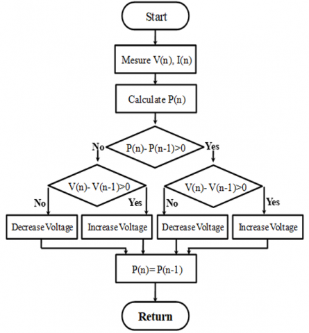 The Perturb and Observe (P&O) MPPT method was used in this work as shown in Figure 4. The P&O method is not only widely used because of its simplicity but also with its ability to be used in real-time. The method operates by perturbing a (changing) the voltage of the solar panel, measuring the power output, and iterations of perturbation-observing continue until the maximum power point (MPP) is found.