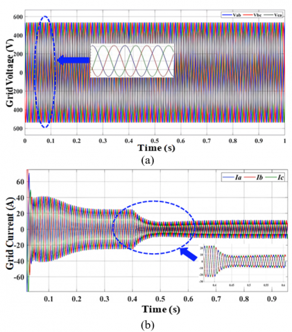 The most important conclusion is that the seven-level inverter exhibits better control and stability. Figures 14(a) present the direct current Id, the Id controls the active power flow. Both inverters are able to track their reference command, but the seven-level inverter shows less overshoot and a more stable and smoother response than the three-level inverter following the change in irradiance. Figure 14(b) present quadrature Current (Iq), the Iq controls the reactive power (which for unity power factor should be zero). The seven -level inverter maintains a much tighter control around zero indicating excellent reactive power management. The three-level inverter has more deviation from and oscillation about zero. Figure 14(c) exhibits DC-Voltage (Vdc). This figure exhibits the stability of the DC voltage from the solar panels. The seven-level inverter maintains a much more stable and constant voltage with very little fluctuation, compared to the three-level inverter, after the disturbance. The three-level inverter shows a much larger dip in voltage and more ripple.