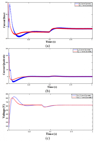 Figure 14. The direct, quadratic currents and Vdc voltage, for three and seven-level inverter: (a) direct current, (b) quadratic current, (c) voltage