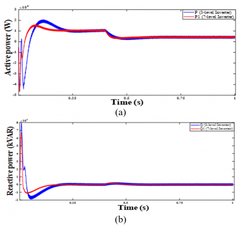 Figure 15. Comparison of power dynamics between three- and seven-level inverters: (a) active power and (b) reactive power