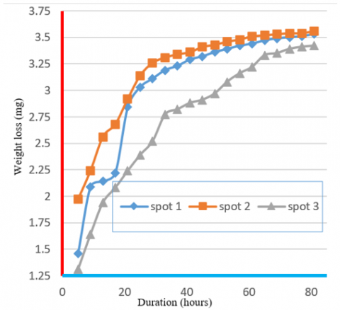 Slower cooling rates make weld centers adopt a balanced and uniform microstructure when compared to fusion lines. The weld's center section shows increased homogeneity because it contains fewer imperfections, which make it more resistant to localized corrosion. This material section contains an equal combination of austenite and ferrite. Yet, its corrosion rate remains lower than the fusion line because its uniform and stable microstructure exists throughout this area. The measured corrosion extends gradually from the surface, indicating lower susceptibility to fast pitting, which typically affects fusion areas. The corrosion rate rises gradually as FeCl₃ affects the solution-stable material, although it does not escalate to match spot 1's destructive speed. The material slowly disintegrates throughout the observation period without developing the harmful localized attacks that would have triggered accelerated corrosion. The microstructure in the welding line end exhibits higher consistency compared to other zones because it experiences minimal thermal effects. The cooling dynamics in this region are milder than in other zones, so it contains fewer defects than fusion areas. The last segment of the weld line shows maximum corrosion resistance because it features homogenous material with high austenite content, since this phase demonstrates better corrosion resistance over ferrite. Initial corrosion rates show that surface defects or phase segregation resulting from high corrosion rates do not affect this material because it maintains a slower acceleration level. Finally, weight measurements indicate the corrosion advances evenly, which results in steady material dissolution at a reduced rate than what is observed at the fusion junction. A steady upward trend in weight loss reveals that corrosion distributes uniformly throughout time, leading to limited areas where rapid weight loss could occur.