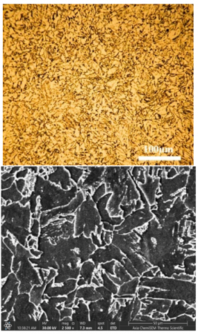 Figure 2. Parent metal microstructure, optical micrographs, and SEM