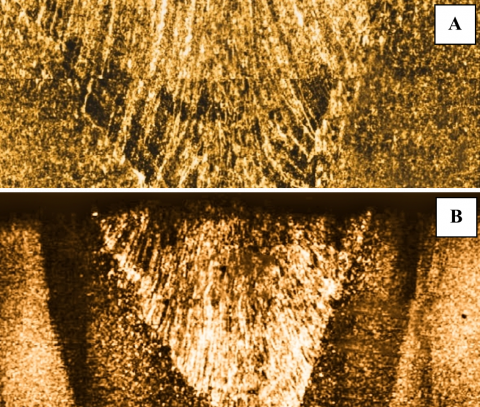 Figure 3. SMAW and GMAW weld cross-section macrographs