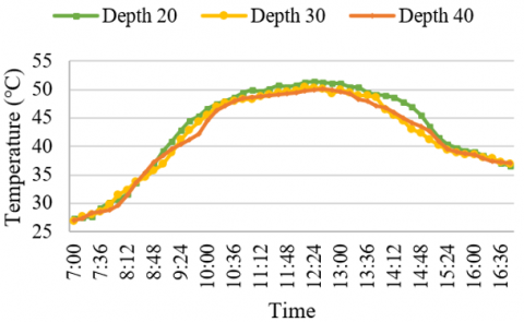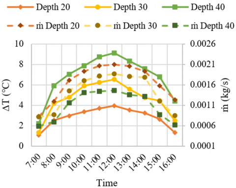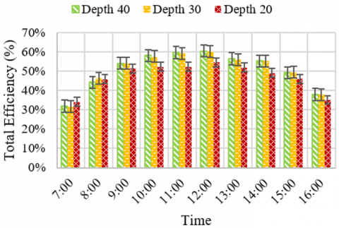 Consistently, the day-average total efficiency was highest for 0.75:1, 30 mm (50.75%), with identical daily terms of 0.75:1, 40 mm (50.71%). The slight percentage-point difference (< 0.1%), coupled with increased fluid volume and potential flow deceleration at 40 mm, indicates diminishing returns when increasing depth beyond 30 mm. Hence, 30 mm is identified as the overall optimum for daily performance.