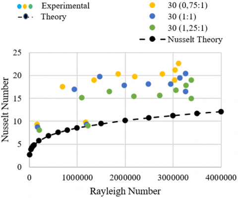 A linear increase in Nu accompanies the rise in Ra at a 30 mm depth, indicating that this design effectively maintains a vertical temperature gradient to support fluid flow without external assistance.