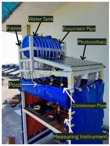 This study utilizes a hybrid floating photovoltaic–thermosyphon (FPV–TS) system developed to enhance solar panels' electrical efficiency and passive cooling through natural fluid circulation within the collector. The system comprises a polycrystalline photovoltaic (PV) panel with a nominal power of 50 Wp (Sunwatt SM-50WP), 17.6% efficiency, and dimensions of 670 × 530 × 30 mm, installed at a tilt angle of 12.5° facing north on an iron frame. The panel is directly coupled with a thermosyphon collector using a thermal paste layer, which facilitates heat absorption from the panel through evaporation and condensation mechanisms without the assistance of a pump. The schematic of the hybrid FPV-thermosyphon system is illustrated in Figure 3.