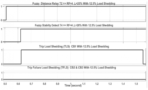 Figure 1 presents the results of the suggested protection strategy on a three-bus, two-generator test network. Faults were simulated at several points on the transmission line connecting Bus-1 and Bus-2. The relay was configured to operate with fault resistances (RF) ranging between 4 and 12 Ω. The worst-case condition of a three-phase short-circuit was modeled using MATLAB/Simulink. In the first scenario, four fault locations were considered, with line lengths varying between 20% and 80% and fault durations lasting from three to seven cycles. Under the same operating conditions, the second and third scenarios used RF equal to 8 and 12 Ω, respectively. Table 1 reports the outcomes for PS states, load shedding, and trip signals corresponding to different values of resistance, line length, and fault duration. The dynamic response of the system is illustrated in graphs, updated every 0.5 s. Furthermore, the study examined in detail how different scenarios and fault resistance (RF) affect overall system responses. The location of the fault and its resistance significantly influence the acquired fault entry time, as demonstrated by measuring the moment of entry of the path within the relay characteristics. The goal was to provide a comprehensive understanding of the system's behavior under various fault conditions. Table 1 summarizes the system's response times during fault occurrences, showing quick responses across all cases, with fault detection time (T2) recorded based on the entry moments in the relay characteristics. Additionally, it was observed that the stability detection factor (T4) time varied with each cycle, increasing as the fault duration increased. This allowed for the prediction of the type of mechanical power swing, whether it was unstable, critical, or stable, providing important information about how the system performed under various circumstances. Following is a summary of the proposed fault management options: For RF = 4 at 20%, 40%, and 60% fault sites, and for RF = 8 at a 60% fault sites, shedding procedures are implemented during the fifth cycle's critical electrical power swing. During the crucial electrical power swing in the sixth cycle, shedding actions are applied to the remaining values and other fault sites of the defined resistance. Suppose the fault exceeds the above cycle numbers. In that case, the system is programmed to perform shedding actions during the fifth or sixth cycle without waiting for the signal from the stability detection sensor, depending on the approaching condition. The 12.5% load-shedding threshold was determined through extensive time-domain simulations that systematically varied both fault location and fault resistance. Results showed that 12.5% is the smallest shedding block that restores system stability across all tested scenarios. Lower values (e.g., 10%) satisfied the requirement in certain cases but failed when the fault location or resistance changed, whereas higher shedding levels reduce system reliability by lowering the system’s ability to supply the maximum possible load regardless of operating conditions. Accordingly, 12.5% was adopted as the minimum, general, and reliable threshold and remains shed until the difference between theta1 - theta2 is less than or equal to 40 degrees before being returned to the system, proving successful in avoiding loss of synchronisation and restoring stability. Shedding operations will occur in a different shedding situation, but the system will not stabilize if the shed load is reduced to 5%. Therefore, if the system remains in this condition, circuit breakers 2&3 will activate protection, shutting off the sources to avoid catastrophic damage.