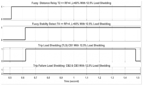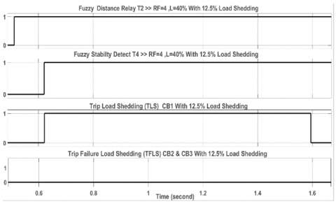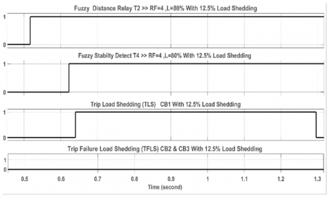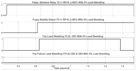 Figure 9 shows the difference between the power angle of the two machines (theta1 - theta2) in the fault resistance scenario of 4 ohms and fault locations ranging from 20% to 80% of the line length, with the fault lasting for seven cycles. The results are presented in two cases: the first using the proposed protection method for shedding loads by 12.5% of the total load, and the second in the absence of shedding. The effectiveness of the proposed shedding method, using fuzzy logic, in reducing the resulting power swing was proven, while the system loses synchronisation in the absence of shedding. It was also observed that as the fault location moves farther from generator 1, the power swing decreases due to the increased line resistance, except for the case at the 40% fault location, where the effect of the distant generator is clearly noticeable. Figures 10 to 13 show the signals associated with the scenario involving fault resistance of 4 ohms and fault locations from 20% to 80%. These include signals for T2, T4, trip load shedding (TLS), and trip failure load shedding (TFLS). These signals confirm the strategy's success in avoiding power swings by noting the absence of the failure trip signal.